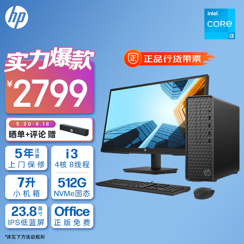 惠普HP 星Box商务办公台式电脑主机(12代酷睿i3 8G 512G高速固态硬盘 WiFi 注册五年上门)+23.8英寸价格:2799.00元!