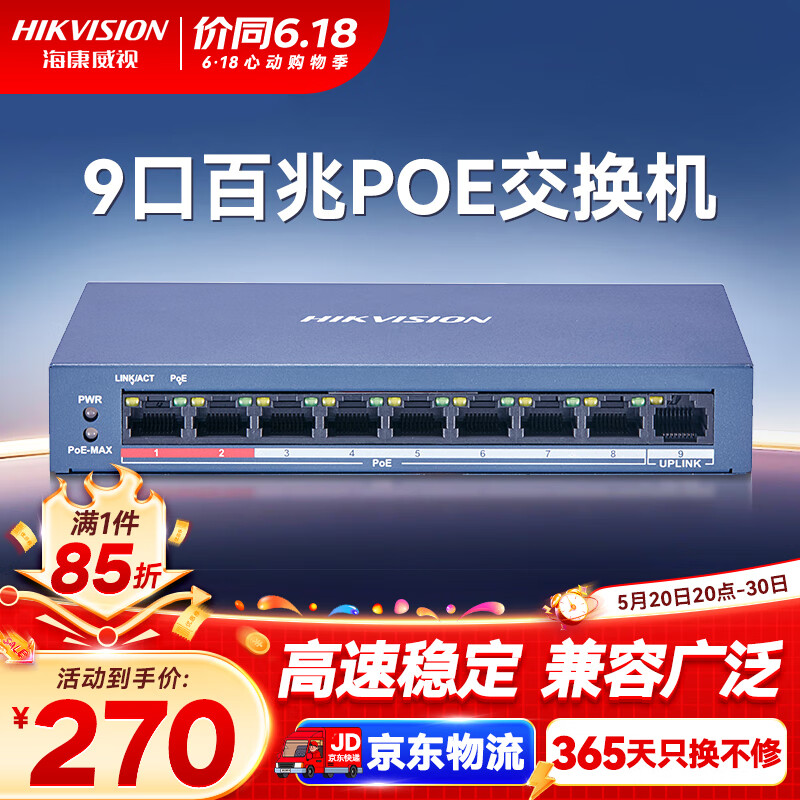 HIKVISION海康威视交换机非网管型8芯POE供电9口百兆网线延长传输模式监控分线器金属外壳散热E0109P-E/M价格:318.00元!