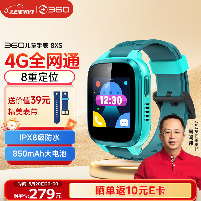 360儿童电话手表8XS 智能语音问答定位支付 学生儿童移动联通电信4G防水视频拍照手表男女孩竹绿色价格:279.00元!