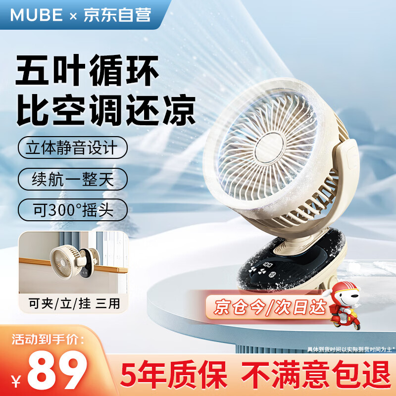 MUBE静音小风扇学生宿舍usb桌面夹子办公室电风扇小型床头上铺充插电款车壁挂式迷你台扇 【米白色】劲爽24H丨10档循环风速丨8重降噪价格:158.00元!