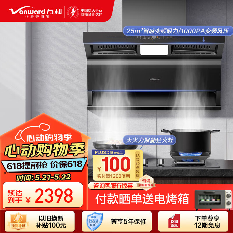万和(Vanward)顶侧双吸1000Pa三腔直流变频家用抽油烟机 燃气灶具烟灶套装 25m3/min吸力 WL860+C5L90S(天然气)价格:2598.00元!
