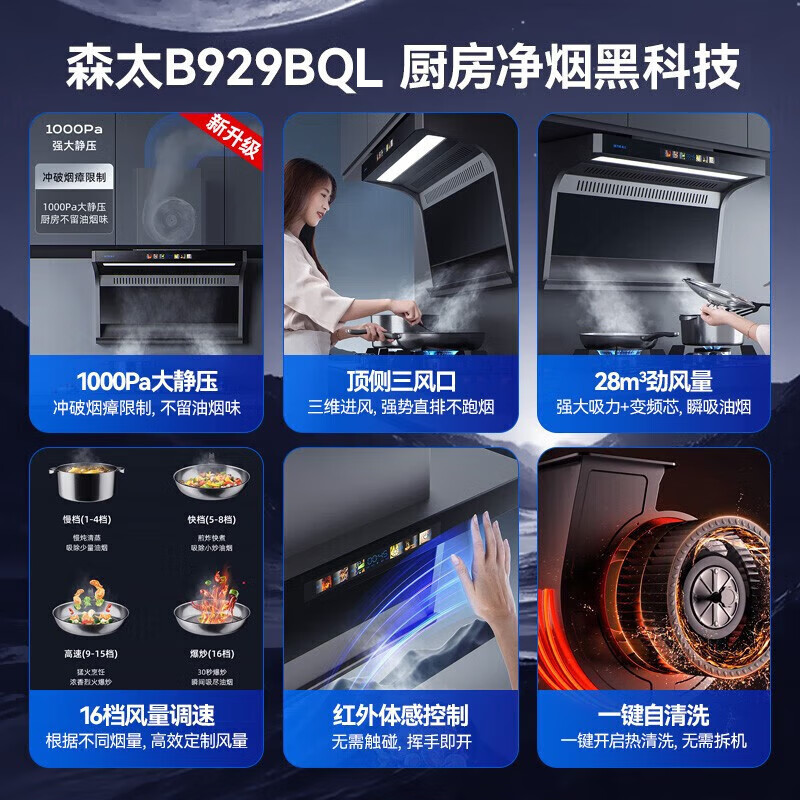 森太(SETIR)变频抽油烟机套装 1000Pa变频顶侧双吸抽油烟机燃气灶消毒柜厨房三件套 B929+TA19+F260(液化气)价格:3199.00元!