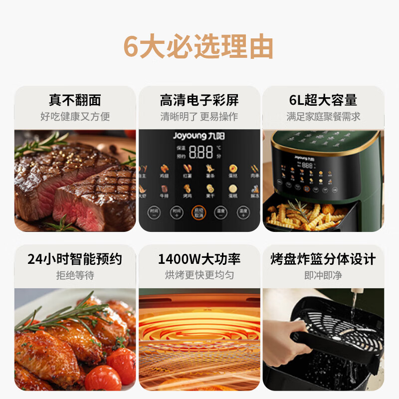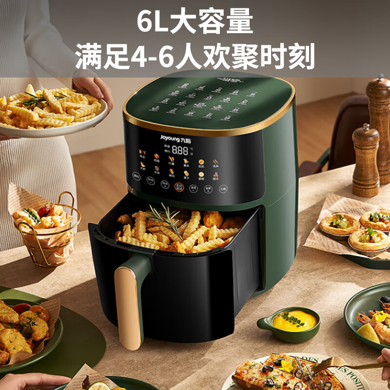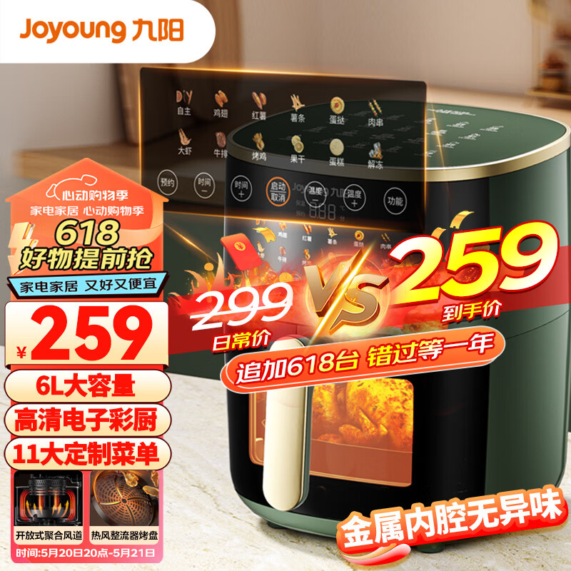 九阳(Joyoung)空气炸锅 可视不用翻面 家用智能 6L大容量多功能 全息触控 金属内腔 无油低脂煎炸KL60-VF506Pro价格:259.00元!