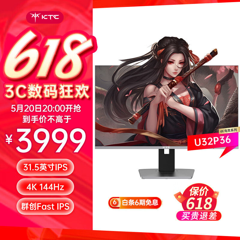 KTC 31.5英寸 4k144Hz FastIPS HDR400 10bit屏120%sRGB广色域 升降旋转壁挂 电竞显示屏 U32P36价格:4199.00元!