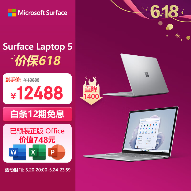 微软Surface Laptop 5 轻薄办公笔记本电脑 i7 16G+512G 亮铂金 Evo认证 15英寸 2.2K高色域触控屏价格:12488.00元!