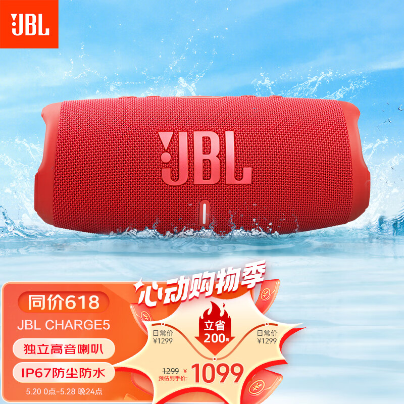 JBL CHARGE5 音乐冲击波五代 便携式蓝牙音箱+低音炮 户外防水防尘 桌面音响 增强版赛道扬声器 红色价格:1099.00元!