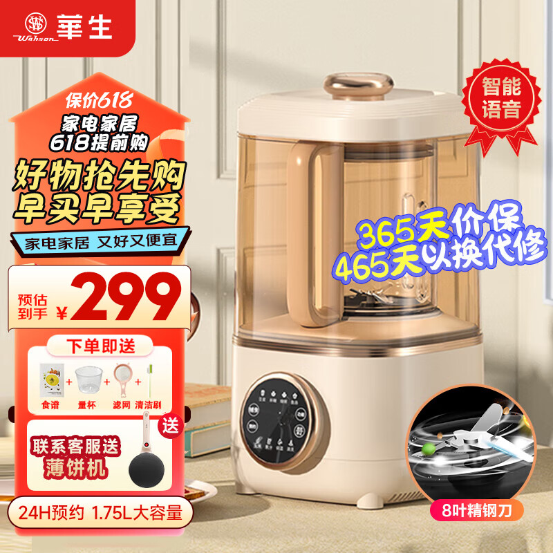 华生(Wahson)破壁机家用免煮五谷杂粮低音多功能豆浆机免过滤榨汁料理辅食机1.75L大容量WS-879价格:299.00元!
