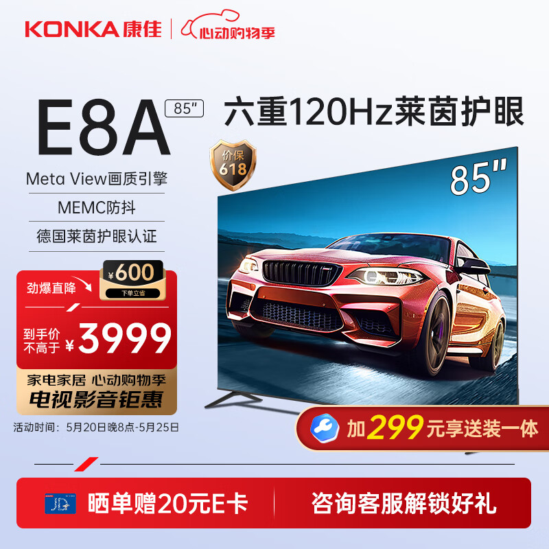 康佳电视 85E8A 85英寸 3+32G 120Hz MEMC护眼电视 4K超清屏 液晶平板电视机巨幕大屏 以旧换新价格:3999.00元!