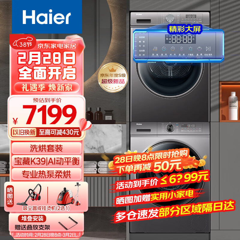 海尔纤美10公斤大容量洗烘套装洗烘组合精华洗洗衣机双擎热泵干衣机XQG100-BD1216+HG100-16价格:7199.00元!