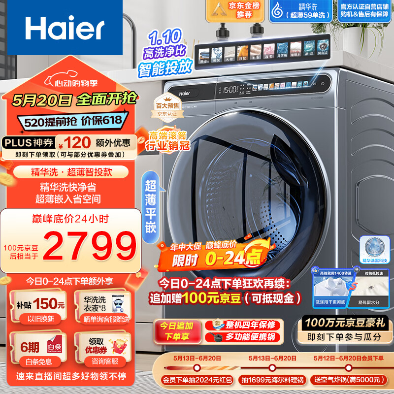 海尔(Haier)滚筒洗衣机全自动单洗 超薄家用10公斤大容量 金榜推荐【精华洗EG100MATESL59S】 以旧换新价格:2899.00元!