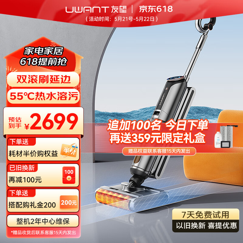 uwant友望洗地机家用 吸洗拖一体机拖地机擦地机吸尘 双滚刷热水洗地机 悬浮手柄助力X200价格:2899.00元!