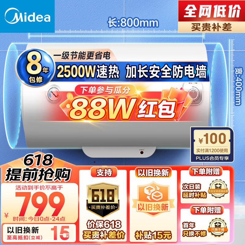 美的(Midea)电热水器2500W速热家用一级能效60升节能省电加长防电墙漏电提醒小型储水式F6025-A5(HE)价格:779.00元!
