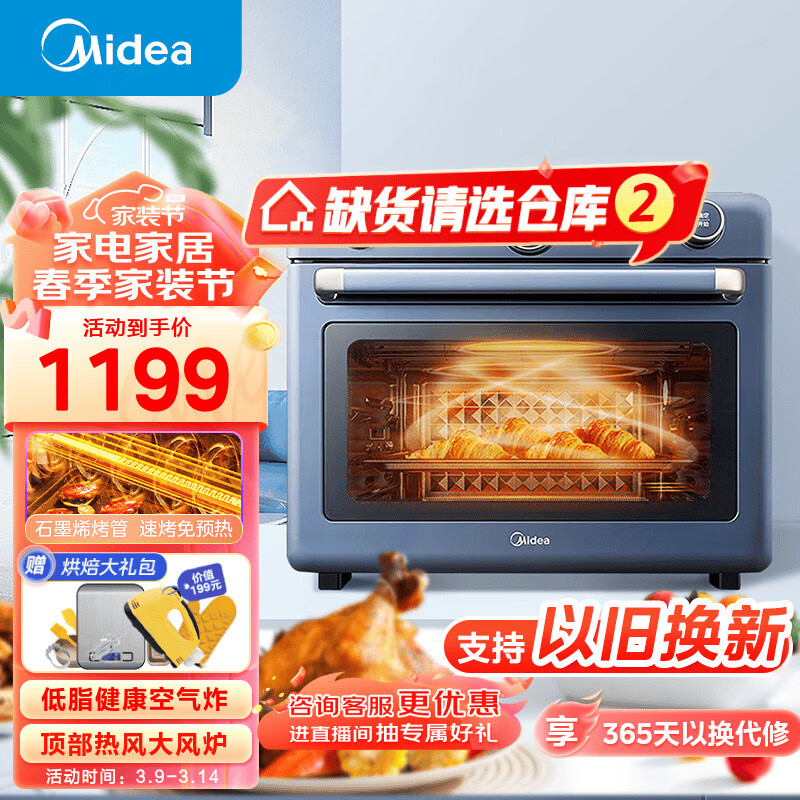 美的(Midea)石墨烯免预热 顶部热风风炉家用智能空气炸电烤箱 35L搪瓷内胆 PT3520W-G 初见P30系列【仓库1】价格:1197.00元!