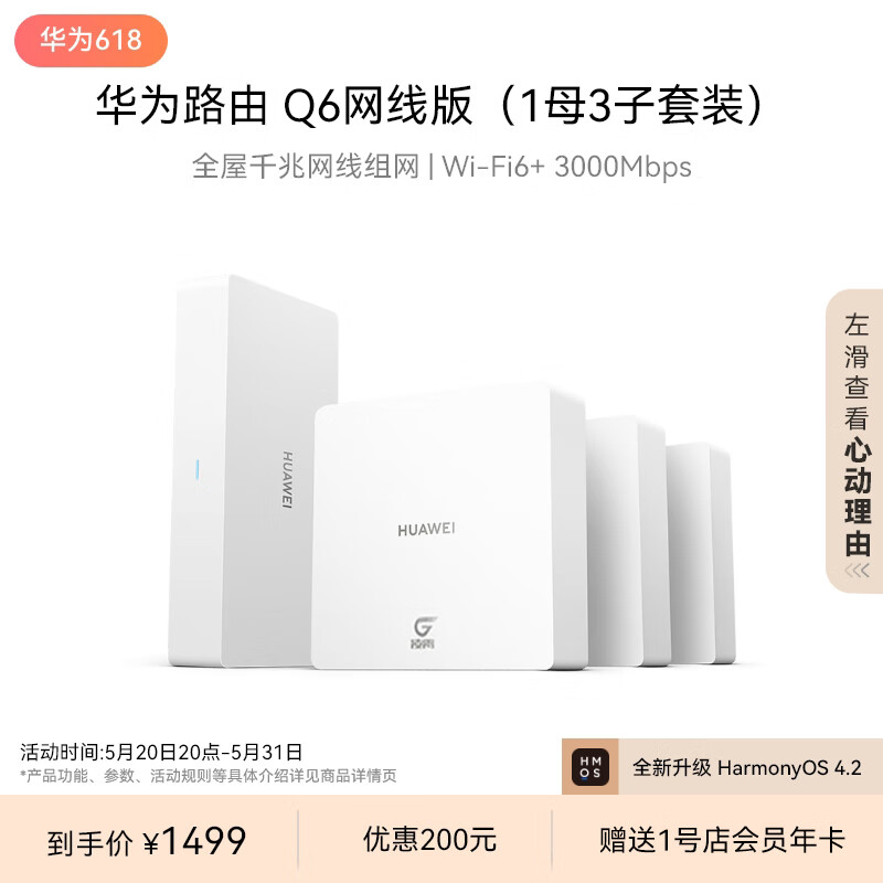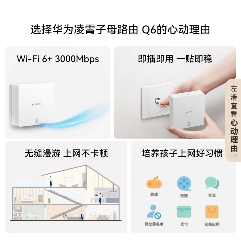 华为路由Q6 网线版 (1母3子套装)子母路由全覆盖 灵犀双WiFi 全屋千兆网线组网 Wi-Fi6+ AC AP面板价格:1699.00元!