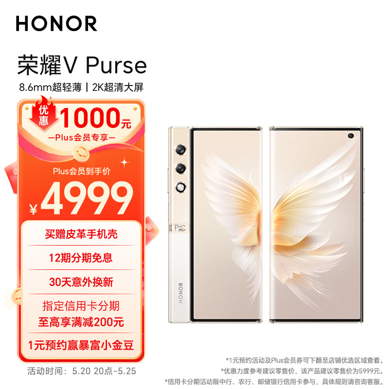 荣耀V Purse 折叠屏 8.6mm超轻薄 2K超清大屏 超自由写真相机 5G AI手机 16GB+256GB 山茶金价格:5399.00元!
