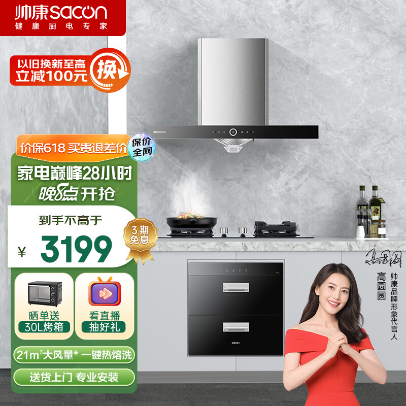 帅康(Sacon)抽油烟机 21大风量家用欧式吸油烟机挥手智控自动清洗T8088+61C+DS1天然气套装价格:3199.00元!