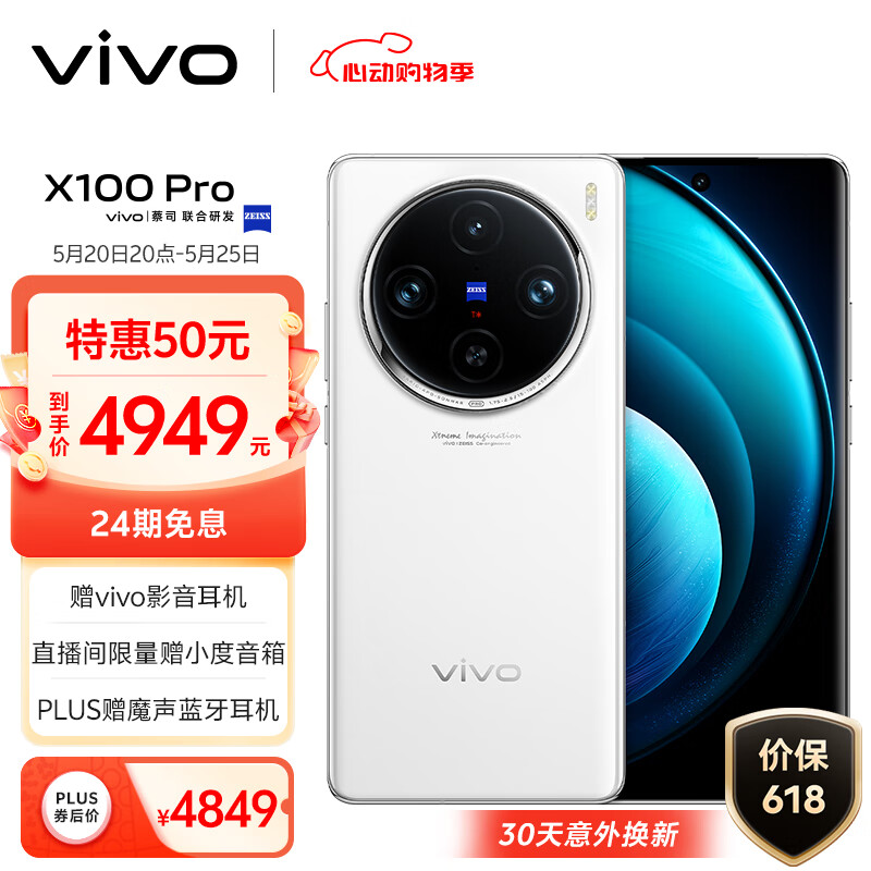 vivo X100 Pro 12GB+256GB 白月光 蔡司APO超级长焦 蓝晶×天玑9300 5400mAh蓝海电池 自研芯片V3 手机价格:4999.00元!