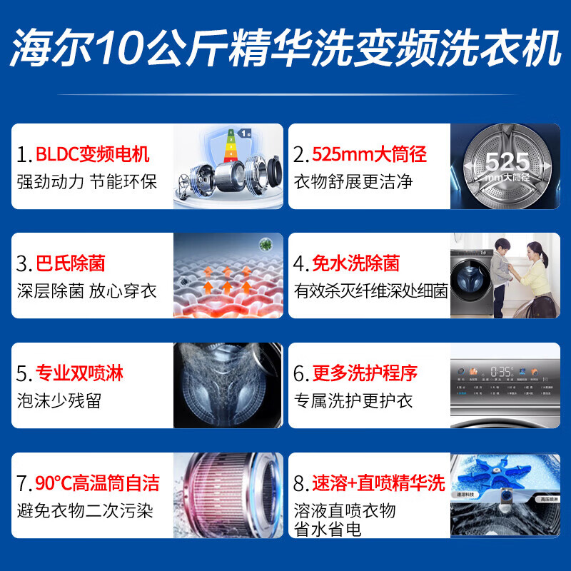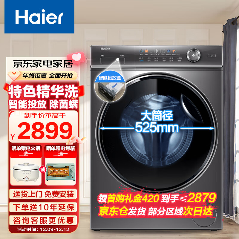 海尔(Haier)【精华洗】10KG全自动变频滚筒洗衣机家用大容量智能投放除菌螨+晶彩屏XQG100-BD14326L[家电]价格:3299.00元!