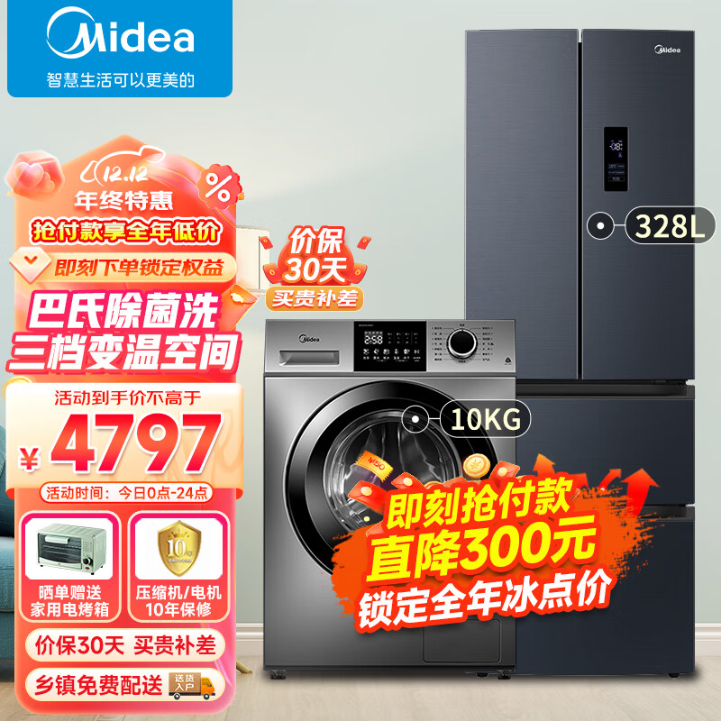 美的(Midea)冰洗套装 345法式多门冰箱+10公斤滚筒全自动洗衣机 洗烘一体 MR-345WFPZ1E+MD100VC133WY价格:4798.00元!