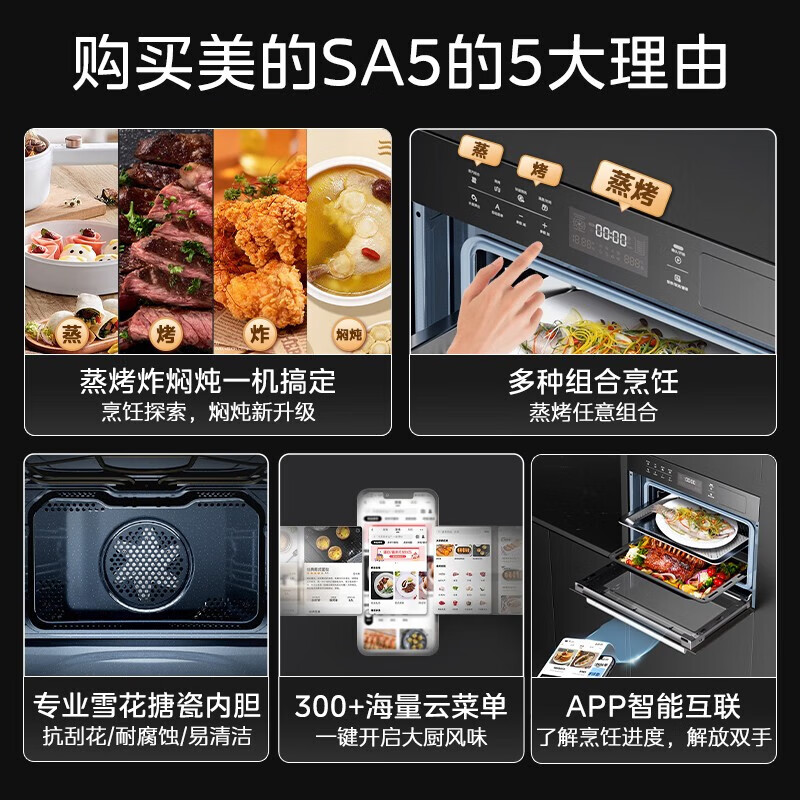 美的蒸烤箱一体机嵌入式55L蒸烤炸三合一组合烹饪搪瓷内胆低温发酵手机APP智控自清洁SA5价格:3499.00元!