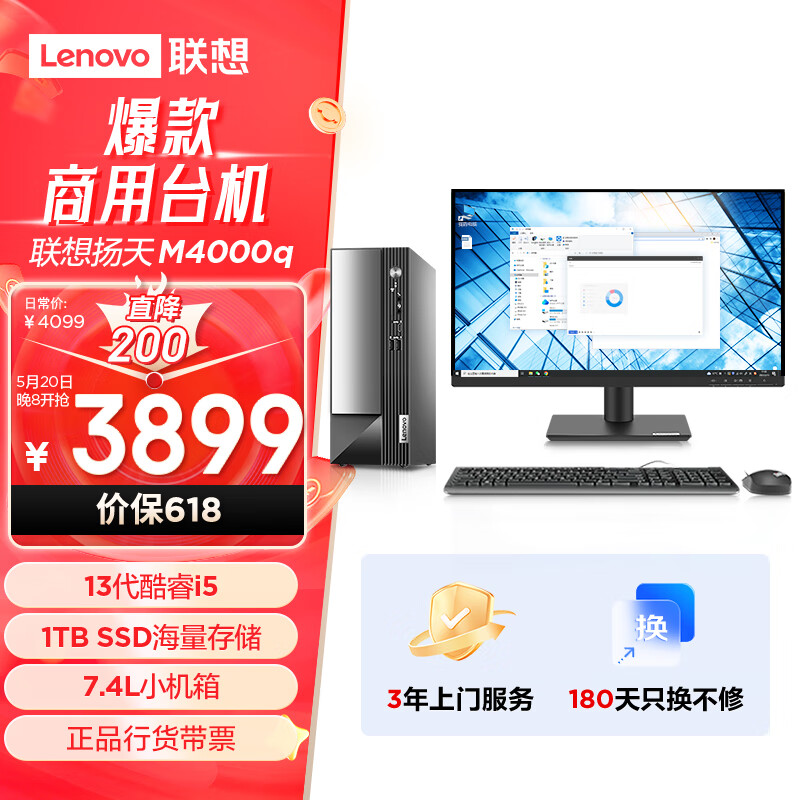 联想(Lenovo)扬天M4000q 商用办公台式电脑主机(酷睿13代i5-13400 16G 1TB SSD)21.45英寸价格:3899.00元!