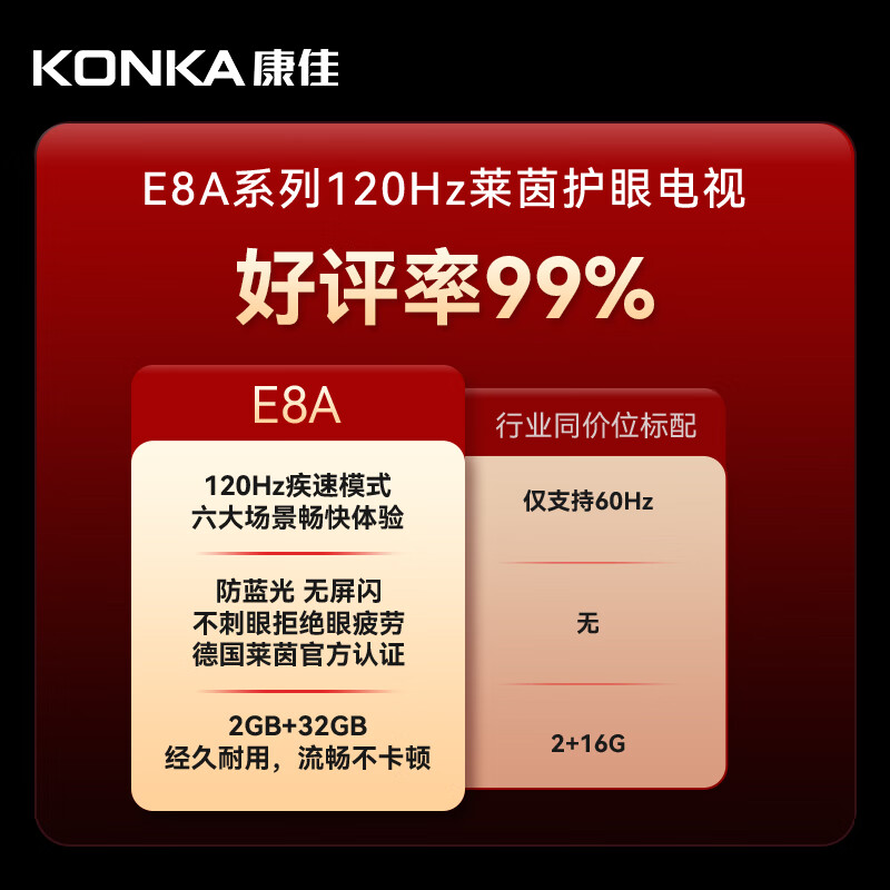 康佳电视 65E8A 65英寸 2+32GB 120Hz高刷护眼电视 4K超清屏 液晶平板电视机排行前十名以旧换新价格:1988.00元!