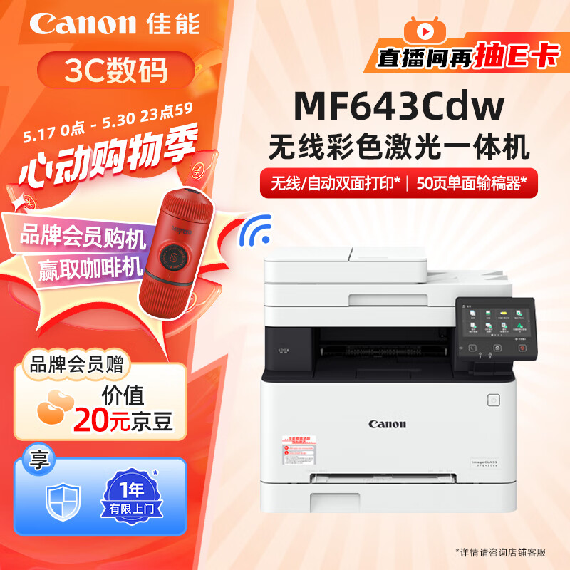 佳能(Canon)iC MF643Cdw A4幅面无线彩色激光多功能一体机(打印/复印/扫描/自动双面/自动输稿器 商用)价格:4229.00元!