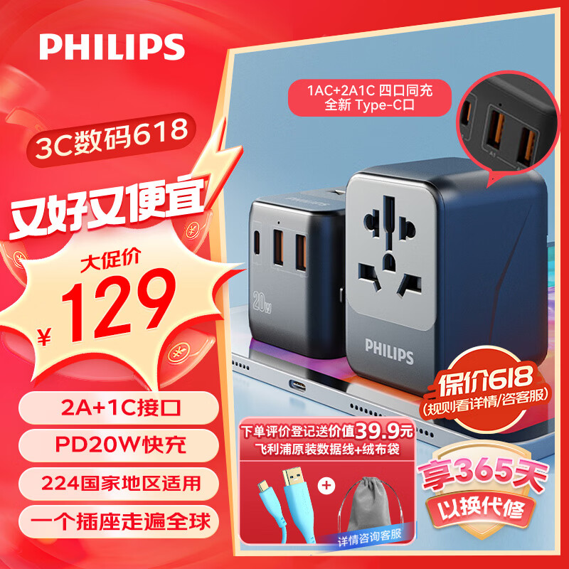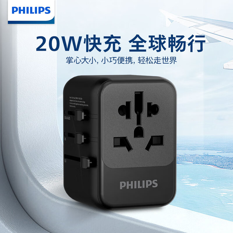 飞利浦(PHILIPS)旅行转换器/插头欧美英澳规一体多国通用PD20W快充USB充电2A1C SPB1006B/93价格:129.00元!