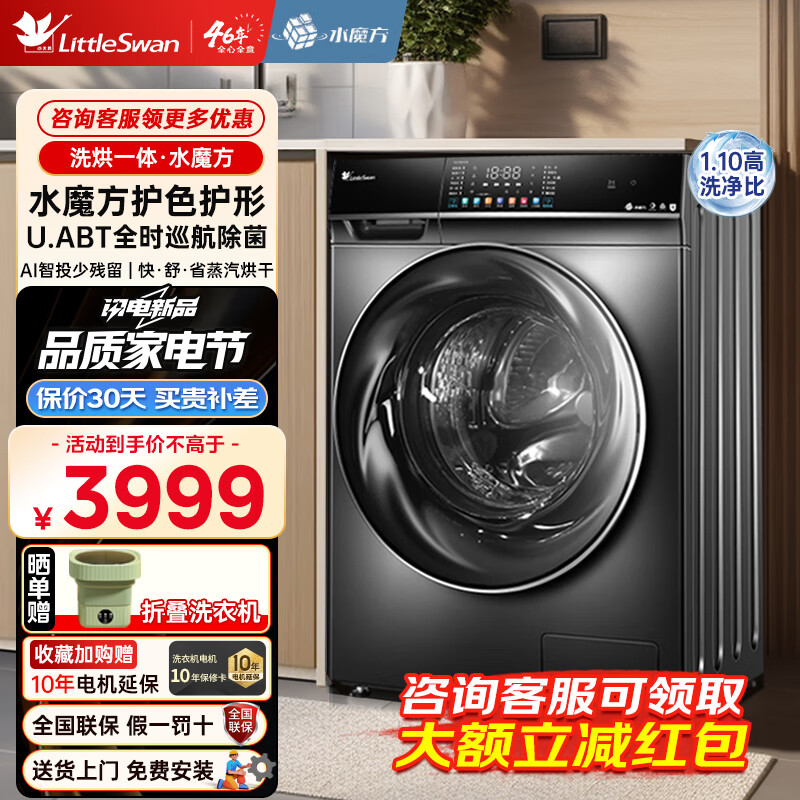 小天鹅(LittleSwan)10公斤洗烘一体滚筒洗衣机全自动水魔方彩屏1.1洗净比家用大容量 智能投放巡航除菌TD100VC8价格:3999.00元!