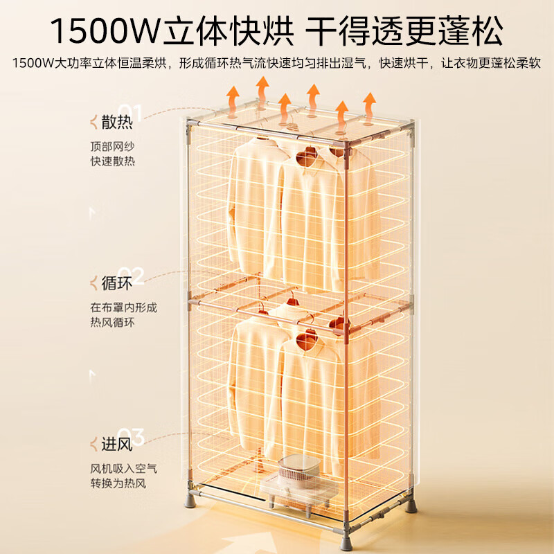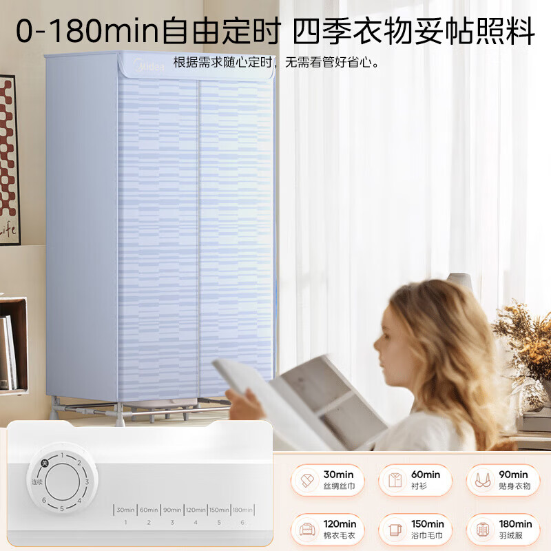 美的(Midea)【大功率急速干衣】干衣机烘干机家用烘衣机双层大容量风干机类定时烘干衣柜式婴儿衣服内衣消毒机 【升级】可折叠设计 600L大容量HBGJ15C1价格:499.00元!
