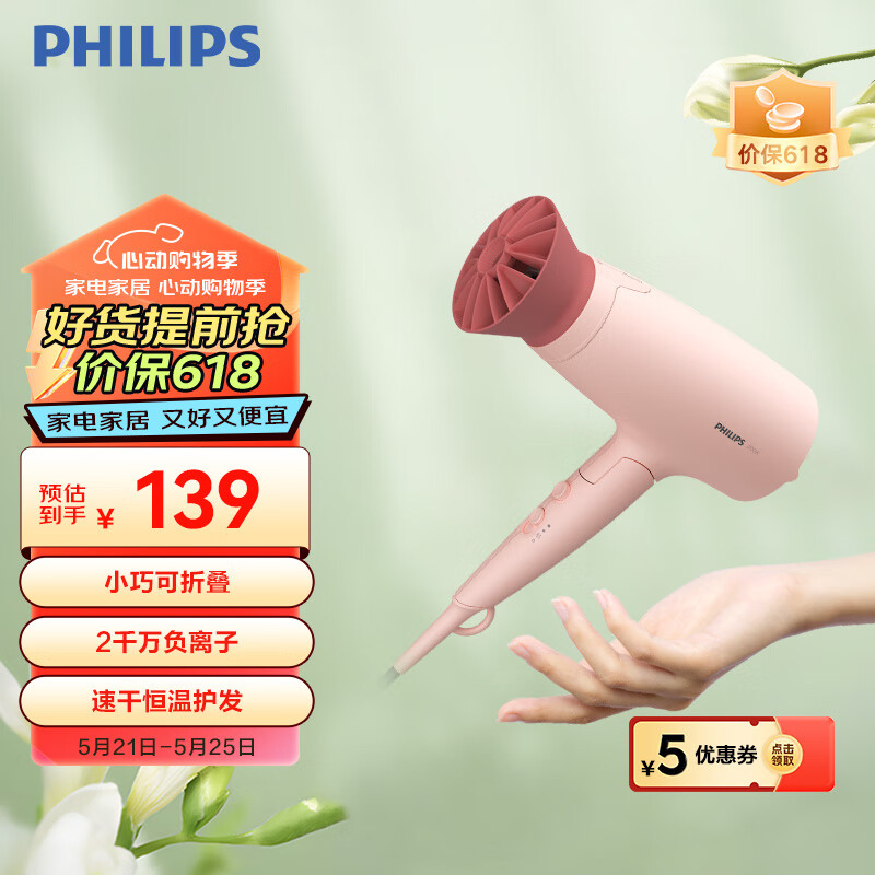 飞利浦(PHILIPS)电吹风机 3系小花筒 大功率速干负离子恒温护发 小花筒 樱花粉 可折叠家用 学生价格:139.00元!