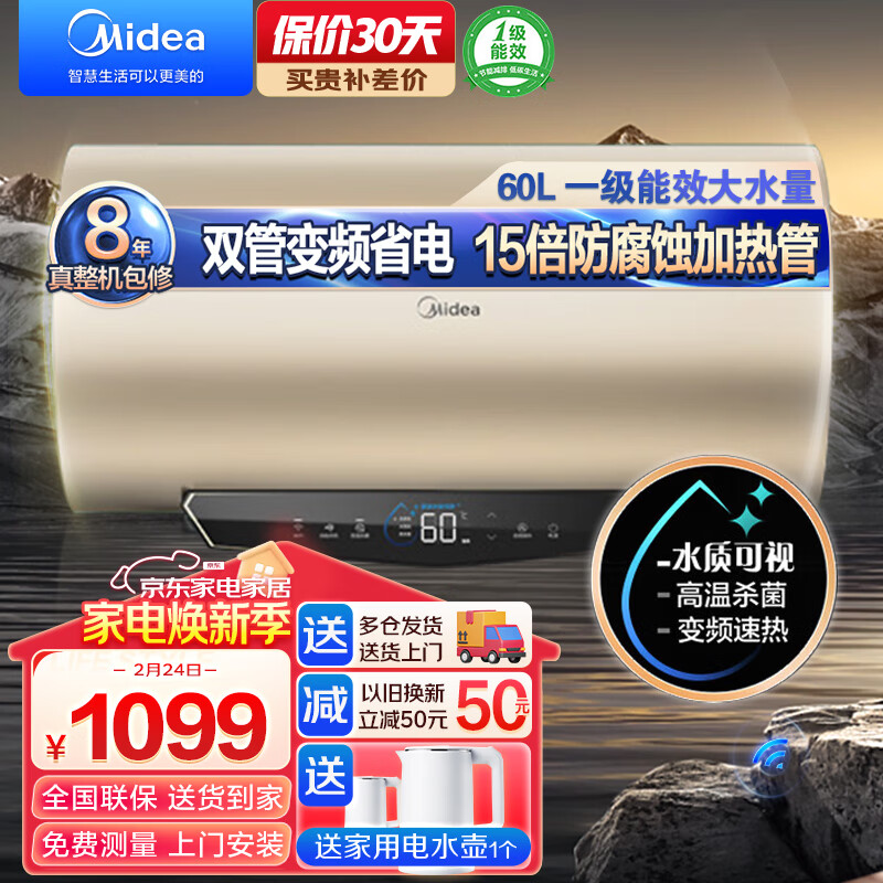 美的(Midea)60升电热水器大功率速热储水式家用60升6.5倍大水量双管变频一级能效以旧换新F6032-JA4(HE)价格:1099.00元!