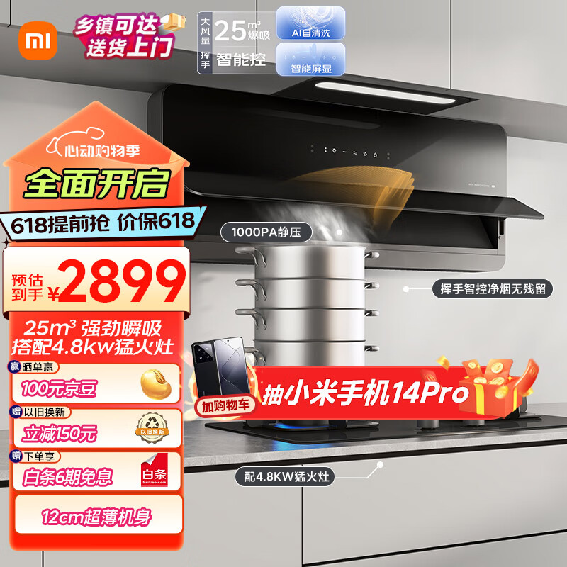 米家小米智能超薄近吸油烟机S1 25大吸力小尺寸抽油烟机燃气灶套装 挥手智控 烟灶联动4.8kw液化气MJ07价格:2899.00元!