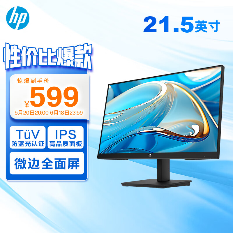 惠普(HP)电脑办公 21.5英寸 FHD IPS 75Hz FreeSync TUV认证低蓝光爱眼电脑显示屏 V22i G5价格:599.00元!