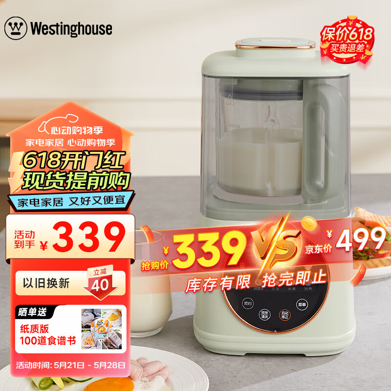西屋(Westinghouse)柔音破壁机家用豆浆机加热全自动榨汁机搅拌机降噪辅食机 WPB09J8抹茶绿价格:339.00元!