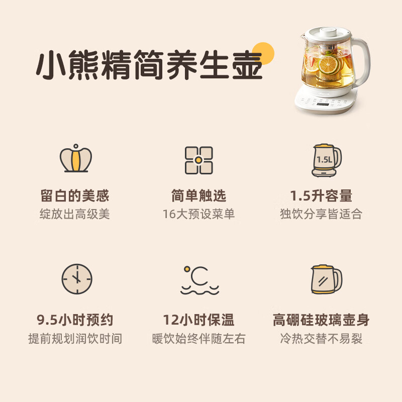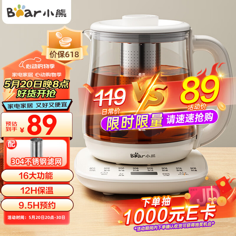 小熊(Bear)养生壶 煮茶壶 烧水壶 可拆卸茶篮煮茶器多段保温迷你玻璃花茶壶电热水壶1.5L电水壶 YSH-D15V9价格:89.00元!