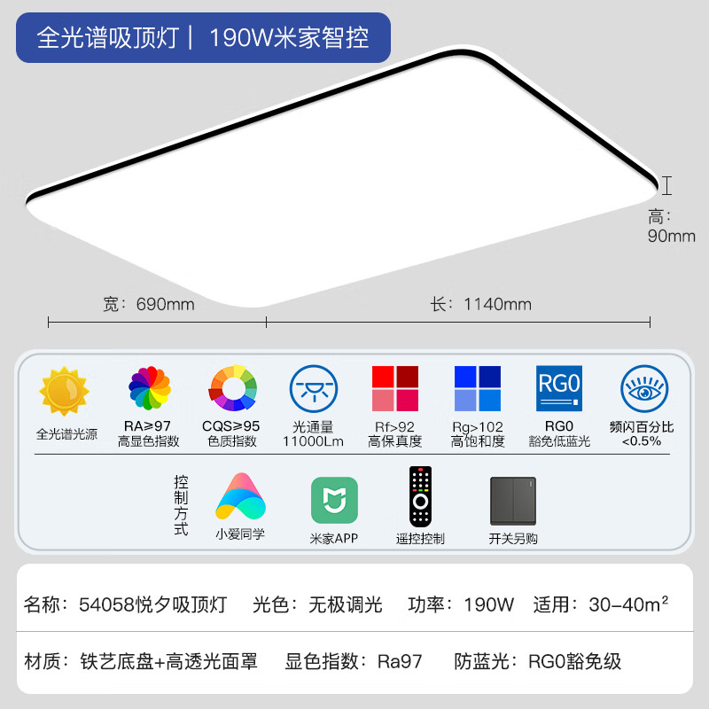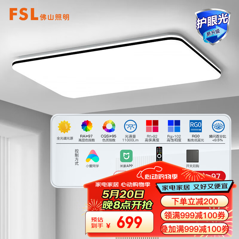 FSL佛山照明全光谱护眼吸顶灯高亮米家客厅灯豁免级蓝光Ra97悦夕190W价格:1099.00元!