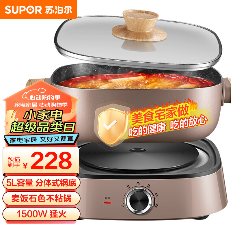 苏泊尔(SUPOR)电火锅 电煮锅电炒锅火锅专用锅涮肉分体式火锅锅家用多功能电锅电热锅5L多用途锅H2727FK622价格:228.00元!