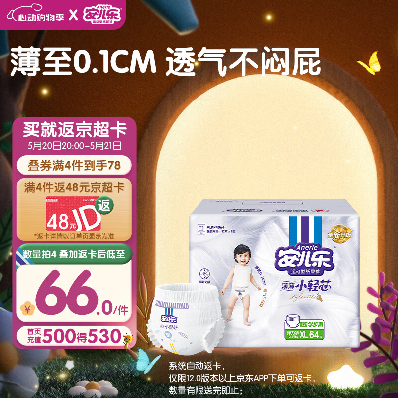 安儿乐ANERLE小轻芯拉拉裤XL64片(12-17kg)超薄透气(新老包装随机发)价格:129.00元!