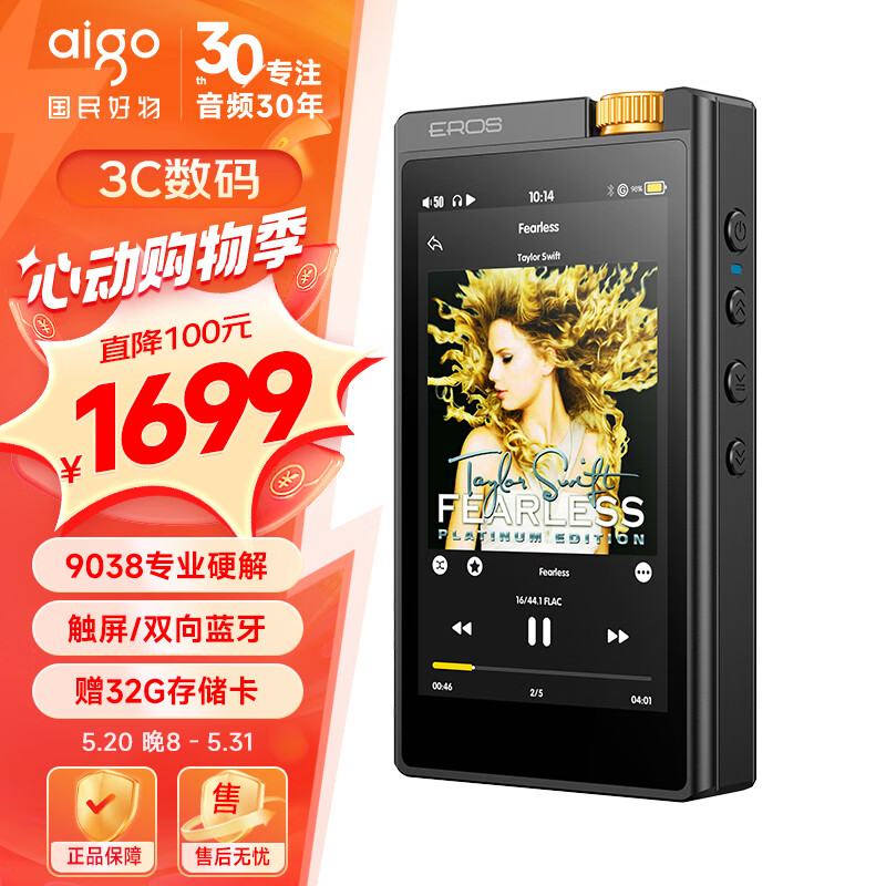 爱国者aigo EROS H05 PLUS 9038专业解码芯片 4.0英寸高清触屏HIFI无损mp3学生音乐播放器DSD双向蓝牙价格:1799.00元!