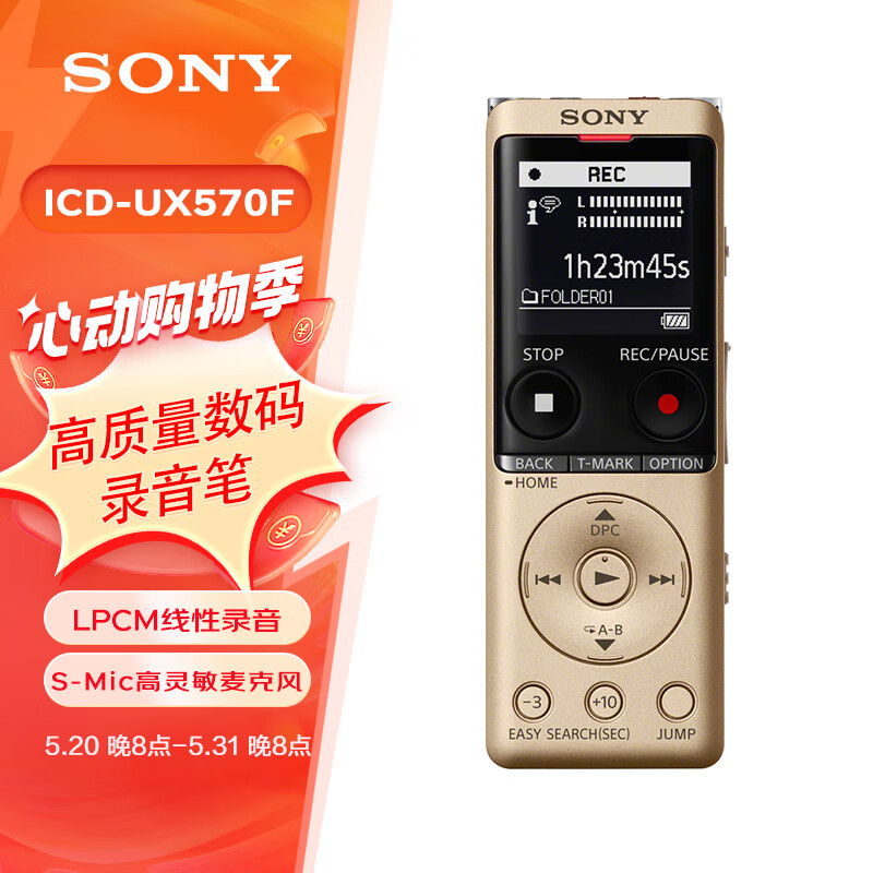 索尼(SONY)录音笔ICD-UX570F 4GB 金色 智能降噪升级款 专业线性录音棒 商务学习采访支持内录价格:759.00元!