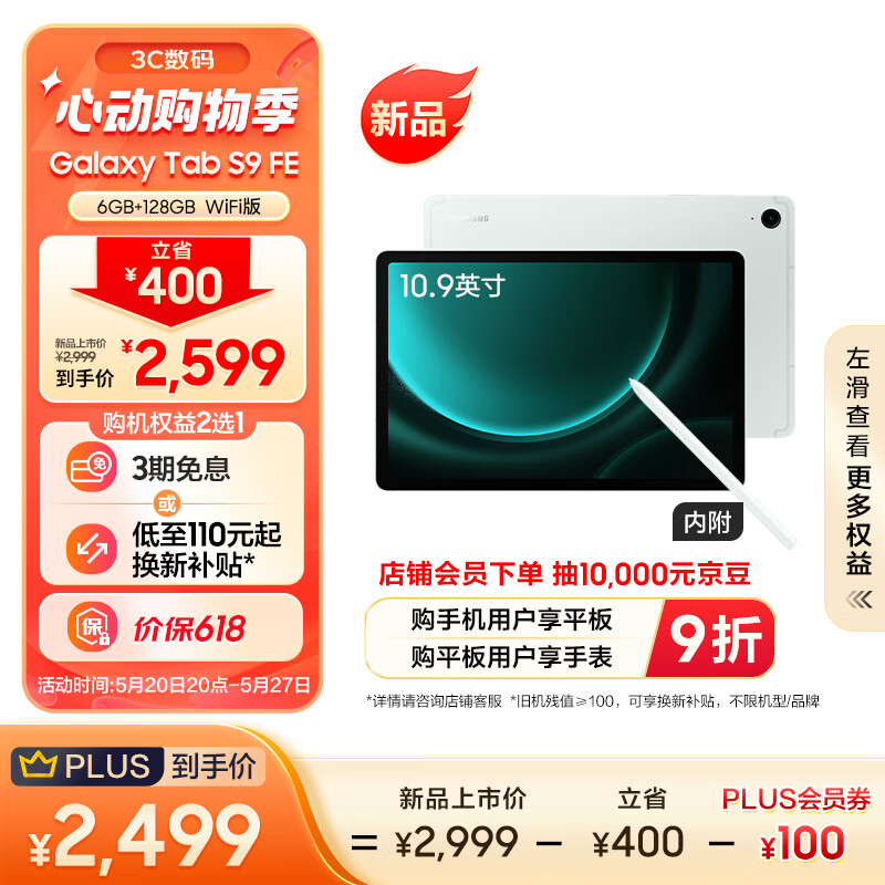 三星(SAMSUNG) S9 FE 2023款平板电脑 10.9英寸 6+128GBWIFI版护眼高清高亮度大屏IP68防水Spen 薄荷绿价格:2599.00元!