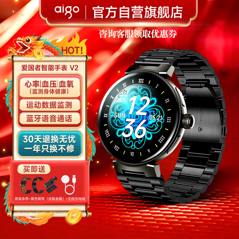 爱国者(aigo)智能手表v2健康监测血压心率多功能蓝牙通话运动手表 黑色价格:398.00元!