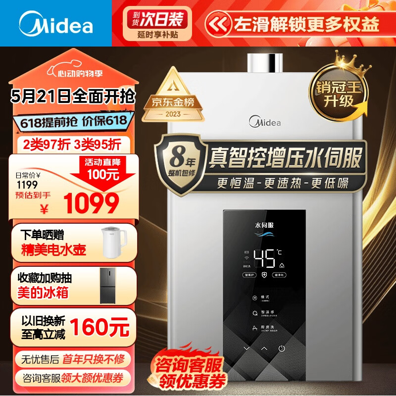 美的(Midea)16升燃气热水器 天然气 增压水伺服恒温 变频节能 开机自检 多重安防 金刚速热舱 JSQ30-MK6耀夜价格:1099.00元!
