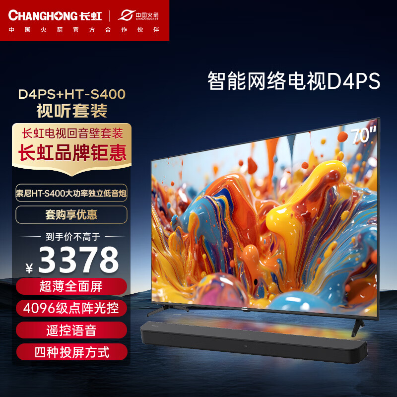 长虹电视70D4PS 70英寸超薄无边屏电视+HT-S4002.1 声道 杜比音效电视音响价格:3889.00元!