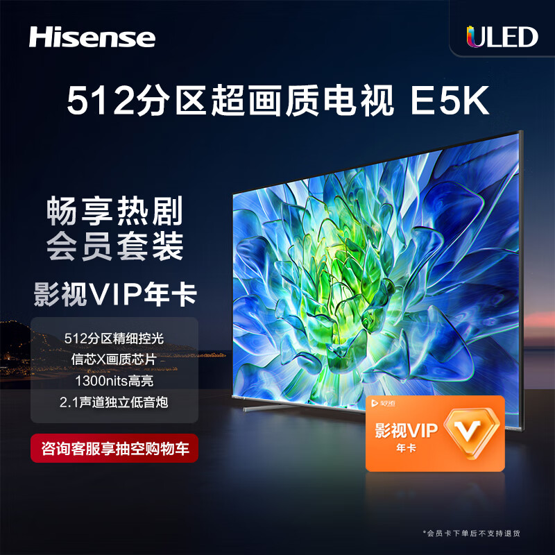 海信电视100E5K+影视VIP年卡 套装 100英寸ULED 384分区 4+128GB 4K 144Hz平板电视机价格:15287.00元!