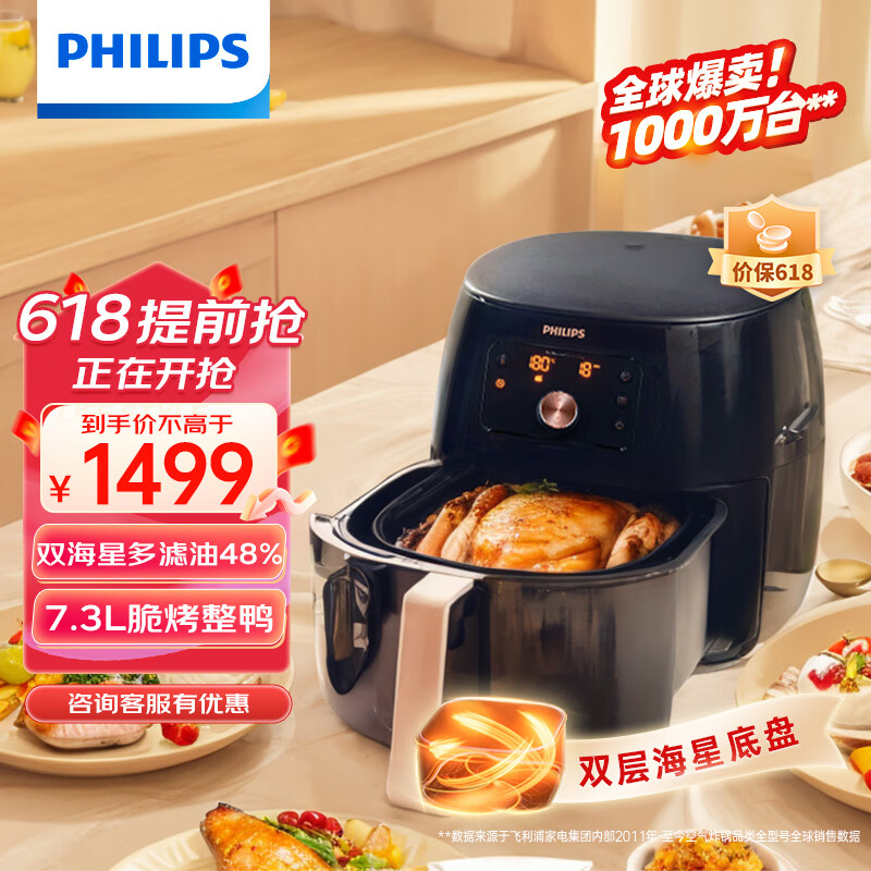 飞利浦(PHILIPS)空气炸锅 家用7.3L双层烤架容量翻倍 减少90%油脂 全自动7倍速热 不用翻面HD9651/61价格:1499.00元!