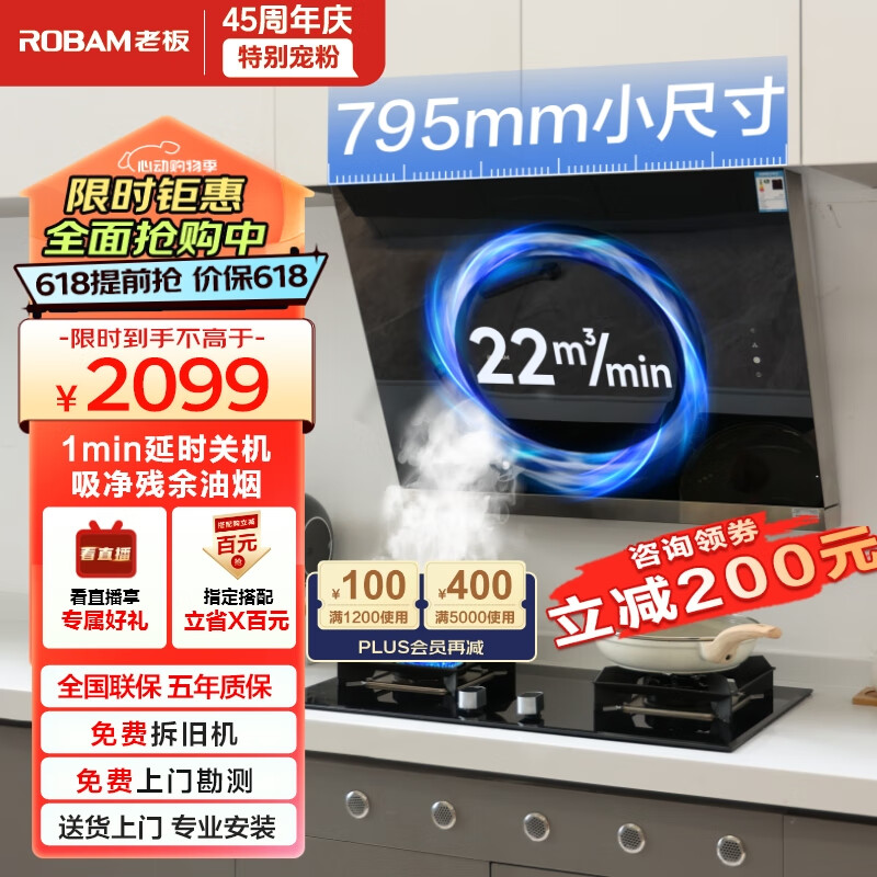老板(Robam)抽油烟机老板油烟机小户型侧吸式油烟机家用22m3大风量吸油烟机免拆洗易清洁烟机26A5SH价格:2299.00元!