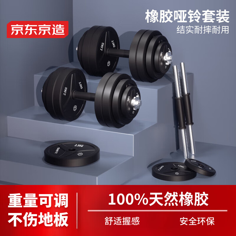 京东京造可调节哑铃 健身杠铃100%天然橡胶 可拆卸套装 30KG价格:429.00元!