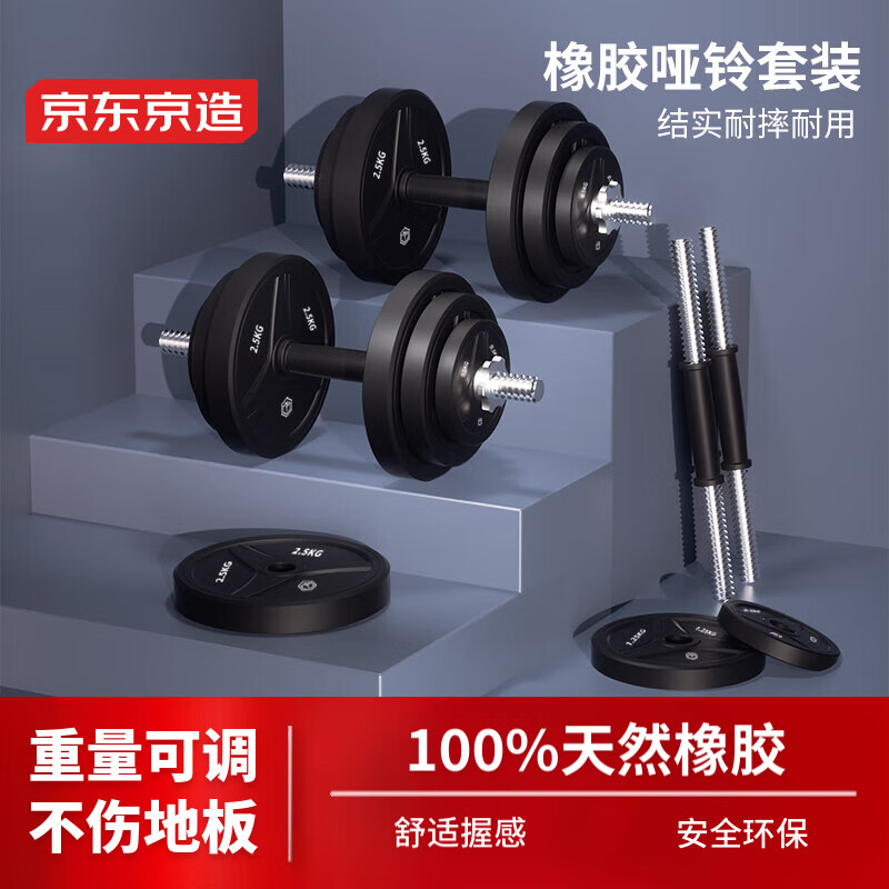 京东京造可调节哑铃 健身杠铃100%天然橡胶 可拆卸套装20KG价格:299.00元!